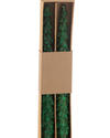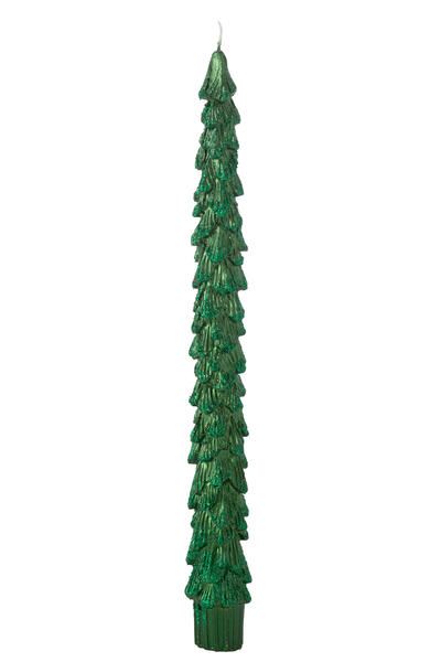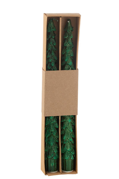 Boîte de 2 bougies décoratives en paraffine, de forme sapin, coloris vert foncé, avec une durée de combustion d'environ 3 heures par bougie